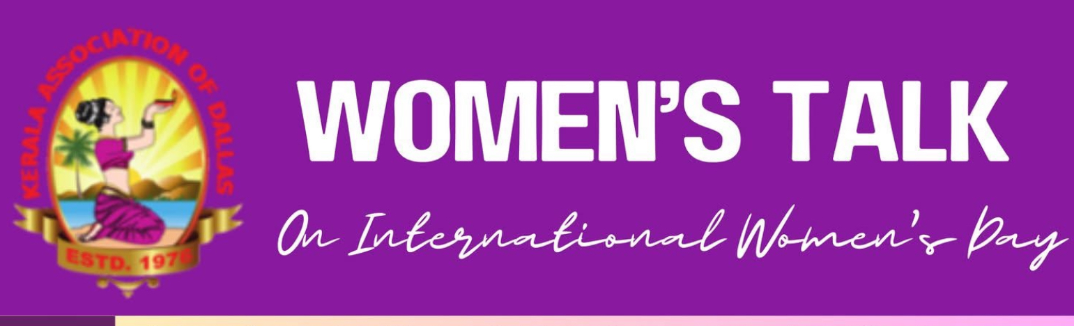ഡാലസ് കേരള അസോസിയേഷൻ അന്താരാഷ്ട്ര വനിതാ ദിനാഘോഷത്തിന്റെ ഭാഗമായി “വിമൻസ് ടോക്ക്” എന്ന പ്രത്യേക പരിപാടി 2025 മാർച്ച് 8-ന് സന്ധ്യ 4:30 മുതൽ 6:30 വരെ KAD/ICEC ഹാളിൽ (3821 Broadway Blvd, Garland, TX 75043) നടത്തുന്നു.
